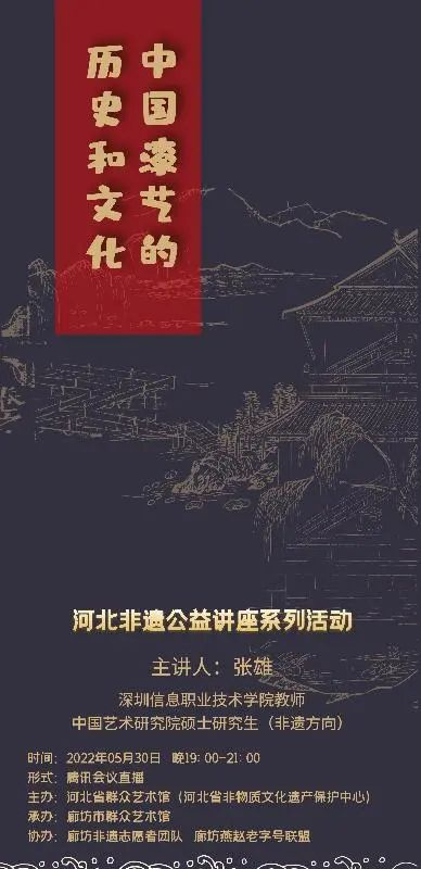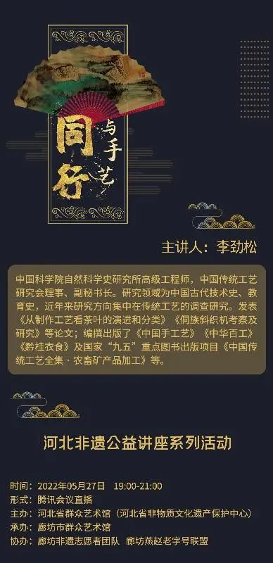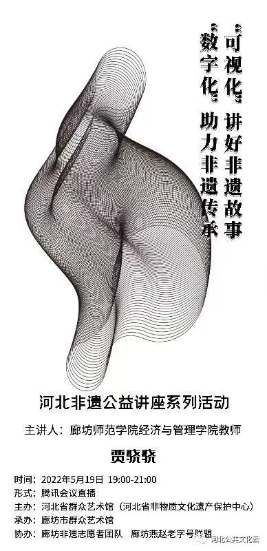 為貫徹落實(shí)國(guó)家及省有關(guān)非遺保護(hù)工作政策文件精神,加強(qiáng)非遺工作人員和傳承人群能力建設(shè),提升非遺保護(hù)工作人員的業(yè)務(wù)水平和管理效能,增強(qiáng)非遺傳承人的傳承能力和創(chuàng)新意識(shí),為全省非遺保護(hù)高質(zhì)量發(fā)展提供智力支持和人才保障,由河北省群眾藝術(shù)館(河北省非物質(zhì)文化遺產(chǎn)保護(hù)中心)主辦,廊坊市群眾藝術(shù)館承辦,廊坊非遺志愿者團(tuán)隊(duì)、廊坊燕趙老字號(hào)聯(lián)盟協(xié)辦的河北非遺公益講座系列活動(dòng)將于2022年5月中旬開(kāi)始,持續(xù)在線上開(kāi)展。