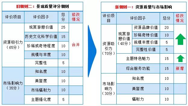 《景觀質(zhì)量評分細則》更名為《資源品質(zhì)與市場影響評分細則》,內(nèi)容上新增加了主題特色魅力、綜合消費功能,評分上強化了觀賞游憩價值、主題特色和綜合消費部分,由此可見對旅游景區(qū)景觀質(zhì)量評定提出了更高的標準要求。