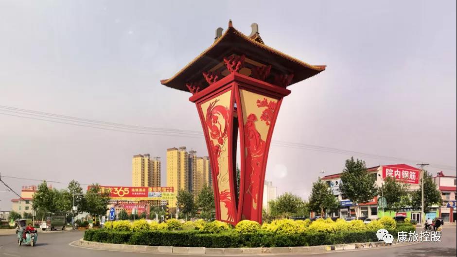雕塑作品常在景觀道路入口空間中起著標(biāo)志的作用。這就要求雕塑的設(shè)計(jì)必須適應(yīng)交通功能,不能影響行人正常通行,不能遮擋交通視線。放在道路入口的雕塑,無數(shù)行人都能感受到它存在,成為街區(qū)入口空間與人對話和交流的媒介。如下圖為行唐幸福路商業(yè)街入口的鏤空雕塑設(shè)計(jì)。