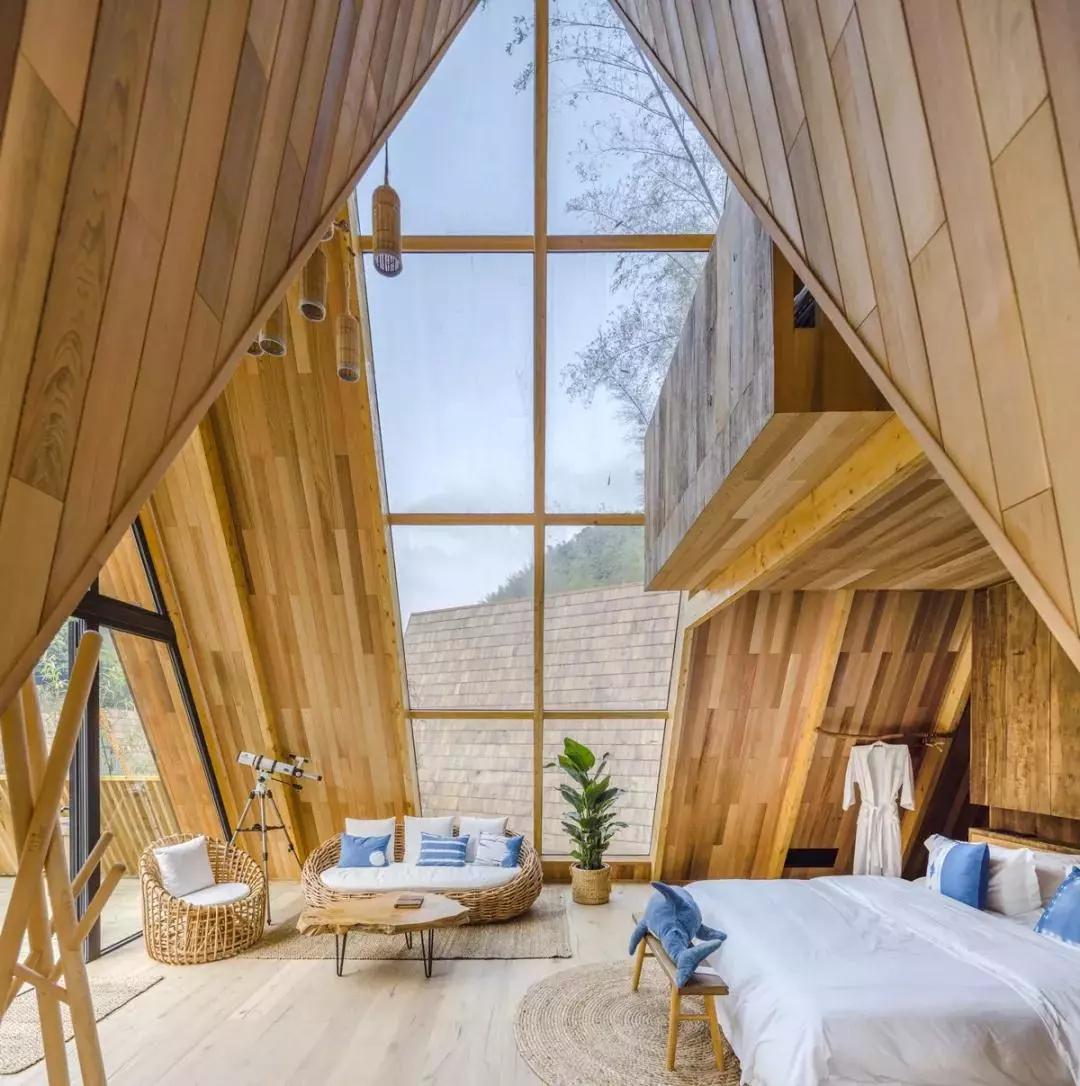 沿著階梯上到一層,一進(jìn)門就是舒適的雙人床和超大的落地玻璃窗,窗口望出去一片綠意盈盈。室內(nèi)擺放的都是純天然原木家具和手工粗陶餐具,配有地暖、空調(diào)、迷你冰箱、藍(lán)牙音箱等設(shè)備,堪稱自然與現(xiàn)代相結(jié)合的典范。