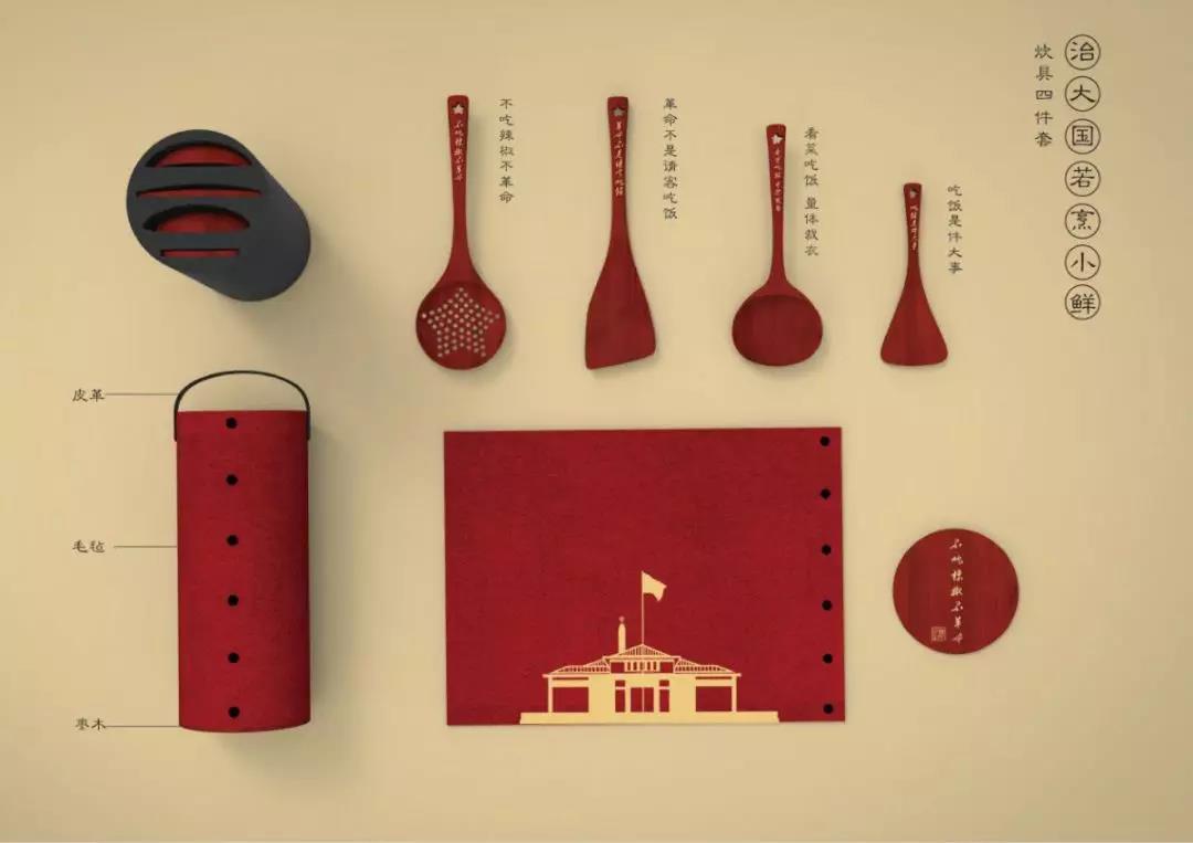 此款炊具套裝正是暗指“治大國若烹小鮮”的比喻,提醒黨員們應保持嚴謹的態(tài)度。炊具選用代表紅色文化的棗木材質,包含漏勺、鏟子、湯勺和飯勺四件,掛鉤處設計為五星形狀,手柄處刻有毛主席的經典飲食語錄,底部分別將紅五星、紅旗、火苗、紅領巾元素融入造型中。毛氈包裝設計的尤為巧妙,將其上扣子打開后可作為隔熱墊使用,棗木的包裝底板還可作為隔熱板使用,最大程度實現包裝的二次利用,既環(huán)保又美觀。
