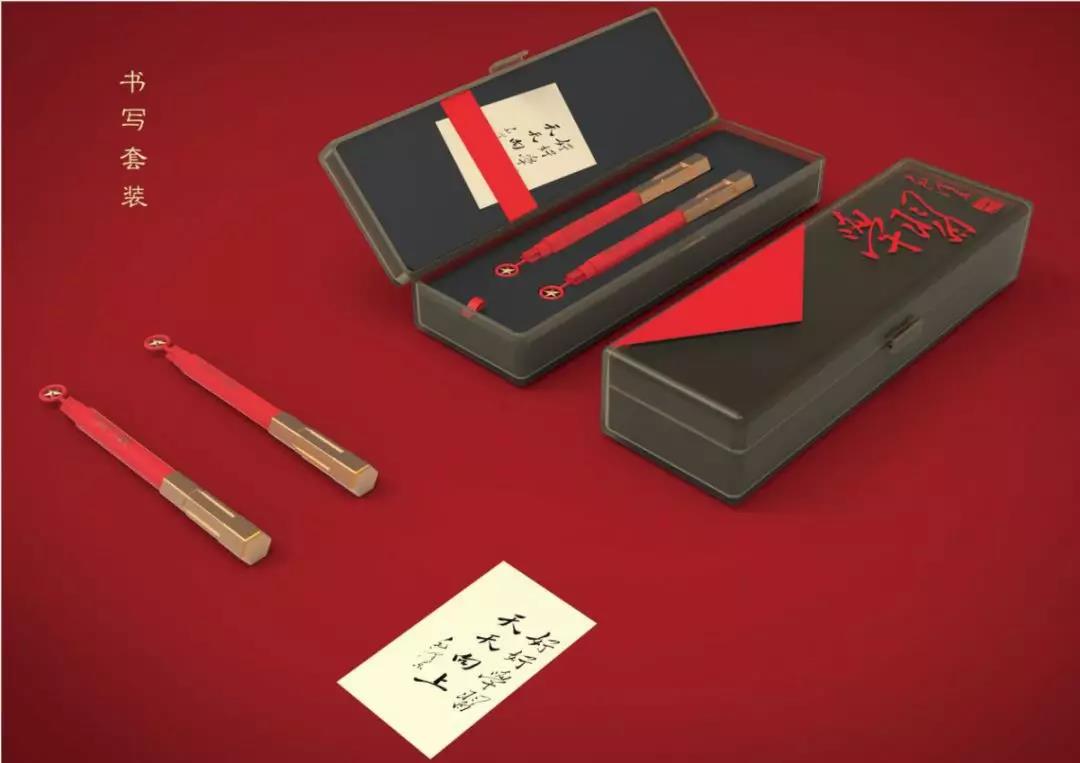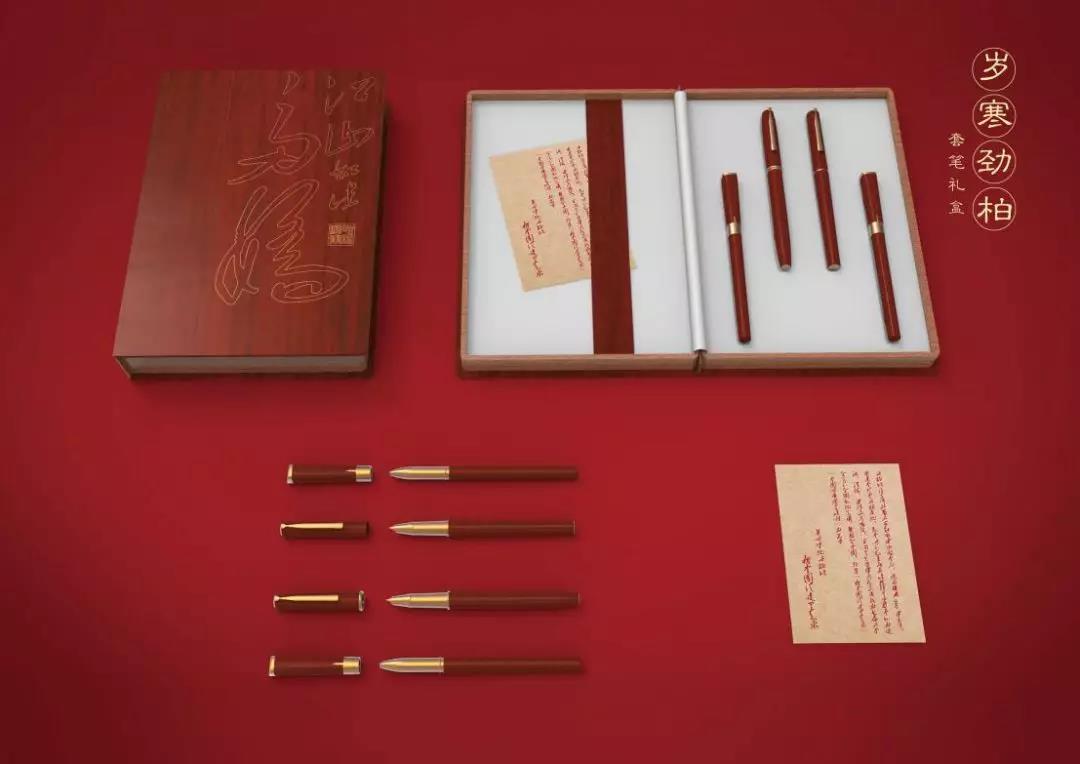“歲寒勁柏”是一款以西柏坡和毛主席書法為設計元素的套筆禮盒,分為男士和女士兩款,鋼筆筆夾處是西柏坡紀念碑剪影造型,筆蓋邊緣鑲嵌西柏坡紀念塔圖案,邊緣刻有毛主席書法“為人們服務”,筆頭處為主席印章“潤之”。銘記偉人是對歷史的尊重,不忘初心,砥礪前行!
