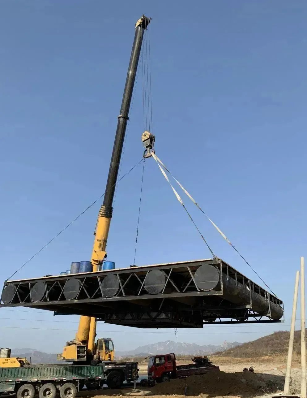 在依托理論對(duì)設(shè)想進(jìn)行反復(fù)推演后,基于對(duì)大槐樹(shù)微生態(tài)的全面保護(hù),集團(tuán)工程人員建造了一艘用于移植臨河大樹(shù)的水上鋼結(jié)構(gòu)浮式平臺(tái)船。這艘平臺(tái)船擁有由若干豎梁焊接在一起、上下平行的底層框架和頂層框架,框架內(nèi)通過(guò)若干槽鋼基材加強(qiáng)連接,保證堅(jiān)固性與穩(wěn)定性。底層與頂層框架之間焊有均勻分布的若干浮筒,頂層框架上方設(shè)置有密度高、強(qiáng)度高的防腐木板層,防止水生蟲(chóng)的寄生。平臺(tái)船的中心還設(shè)有盛放口,盛放口連接下凹結(jié)構(gòu),下凹結(jié)構(gòu)中放置有移栽大樹(shù)的根系護(hù)框。