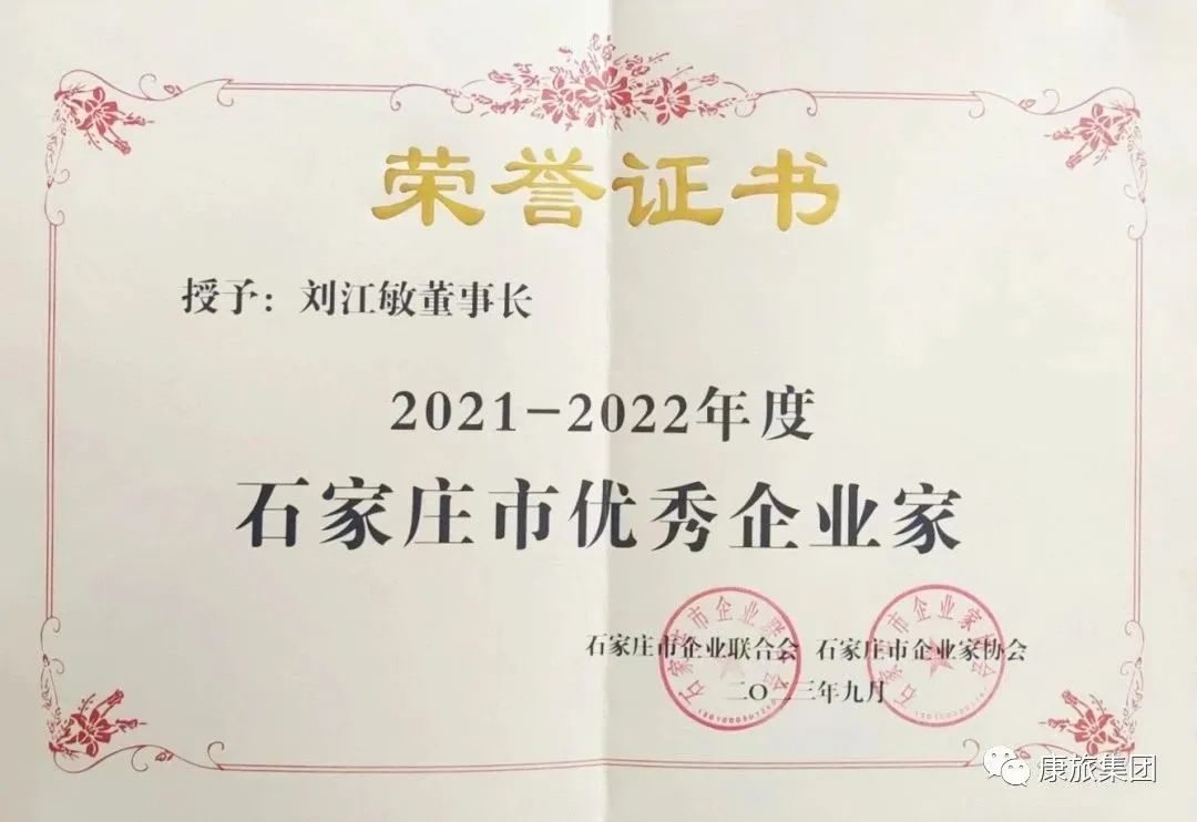 近期,經(jīng)石家莊市企業(yè)聯(lián)合會、石家莊市企業(yè)家協(xié)會駐會會長辦公室研究評定,授予康旅控股集團董事長劉江敏“石家莊市優(yōu)秀企業(yè)家”稱號!二度蟬聯(lián),實至名歸!