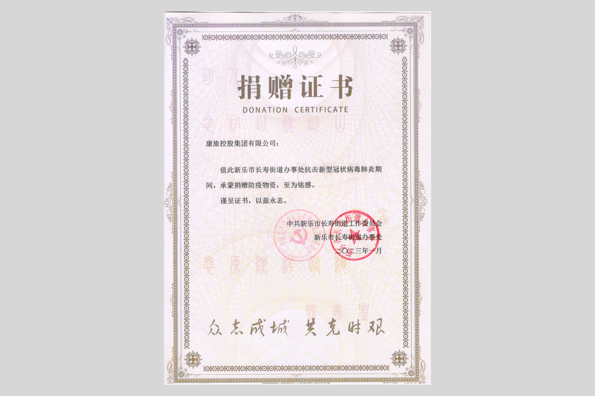 新樂市長壽街道辦事處捐贈證書