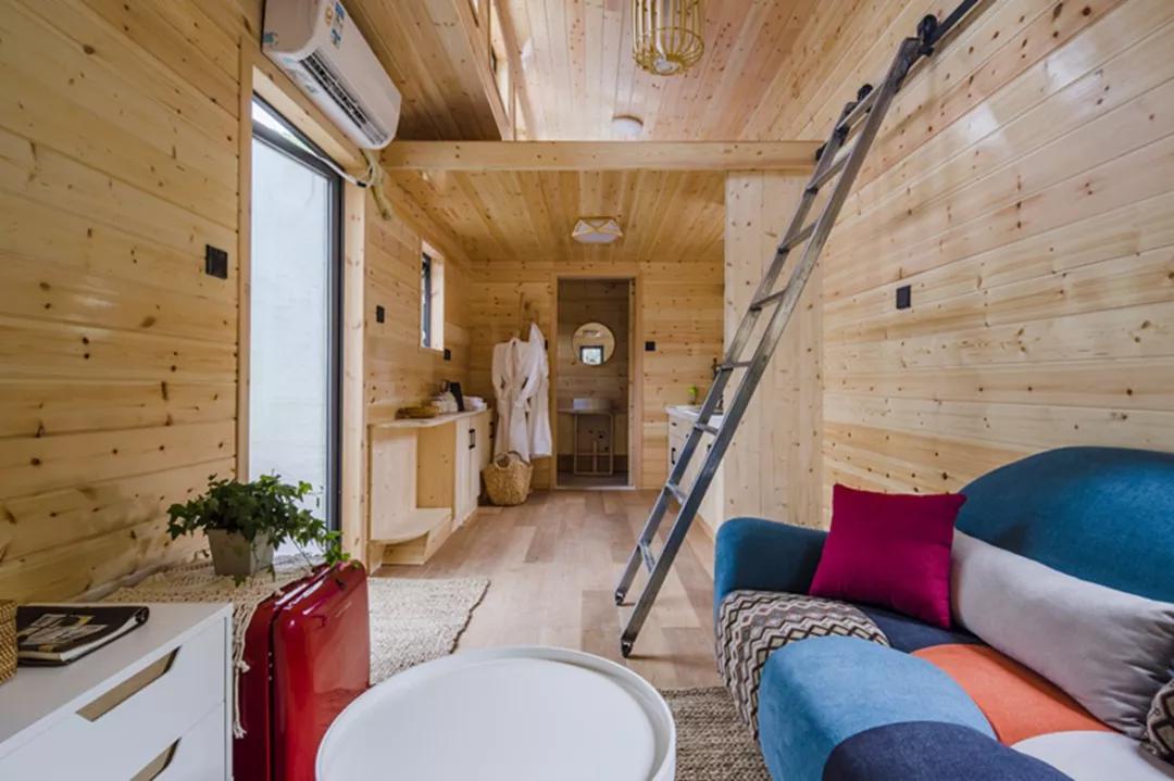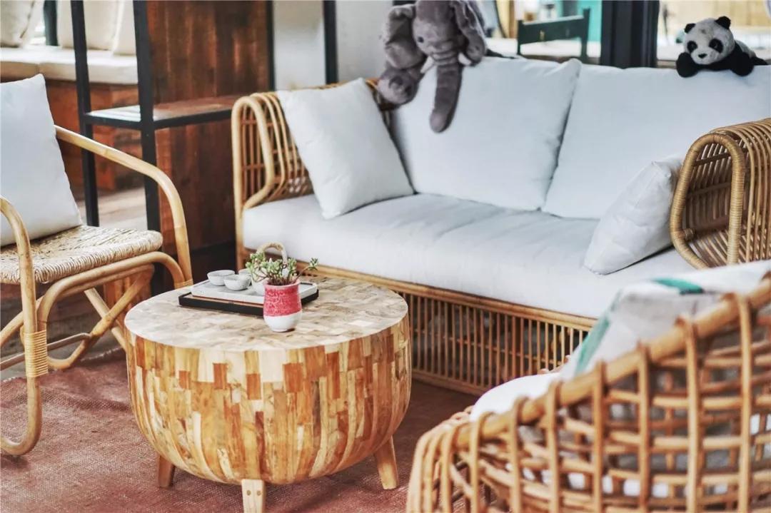 沿著階梯上到一層,一進(jìn)門就是舒適的雙人床和超大的落地玻璃窗,窗口望出去一片綠意盈盈。室內(nèi)擺放的都是純天然原木家具和手工粗陶餐具,配有地暖、空調(diào)、迷你冰箱、藍(lán)牙音箱等設(shè)備,堪稱自然與現(xiàn)代相結(jié)合的典范。
