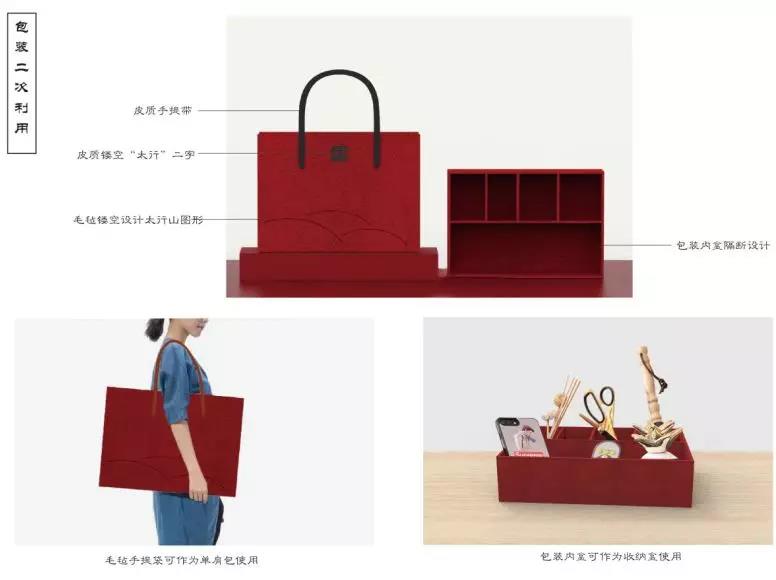 此款調料瓶套裝選用代表紅色文化的棗木材質,將太行山五種特產—山楂、花生、雪梨、柿子、大棗融入到產品造型中,四個棗木調料瓶生動形象,底部托盤山巒起伏似太行山,調料罐夾在山巒中可更加穩(wěn)固,上有“太行五寶”篆體印章描金加以點綴,突出主題更顯精致。柿子造型的調料球材質為唐山骨瓷,質薄而耐高溫,可在沸水湯鍋中使用,頂部銜接不銹鋼鏈,鏈頭設有掛鉤可在煲湯時鉤在鍋邊上并且方便取出。禮盒包裝采用紅色毛氈材質,內盒可作為收納盒,手提袋亦可作為單肩包使用,環(huán)保美觀。