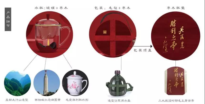 這款茶杯便是以毛主席命名的“勝利杯”為杯型,以獨特的棗木結合玻璃材質,巧妙將太行山與西柏坡紀念碑的景象呈現出來,紀念碑圖案上覆有熱敏材料可感知溫度,當水溫達到55度時紀念塔會顯現紅色提醒用戶防止燙傷。茶漏的太行山造型獨具匠心,蓋鈕處的“冀”字突出河北特色。包裝禮盒整體仿軍用水壺既視感,采用毛氈盒身和棗木盒蓋結合方式,棗木蓋上正面刻有毛主席在三大戰(zhàn)役勝利后的著名論斷“兵民是勝利之本”,背面刻“冀”字印章,亦可作為杯墊使用。