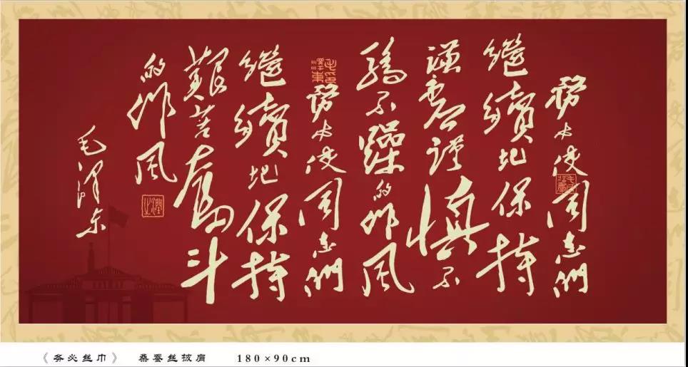 此款《務必絲巾》以西柏坡時期毛澤東同志提出的“兩個務必”為設計來源,將毛主席書法、印章和西柏坡紀念館圖案三種設計元素融入其中,紅色與黃色的國旗配色彰顯紅色文化,采用100%桑蠶絲材質,輕薄透氣。絲巾披在身上,仿若一副行走的書法作品。
