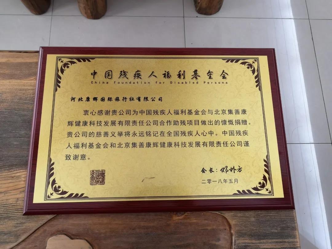 2018年5月,中國殘疾人福利基金會為康旅集團(tuán)頒發(fā)榮譽(yù)獎牌。