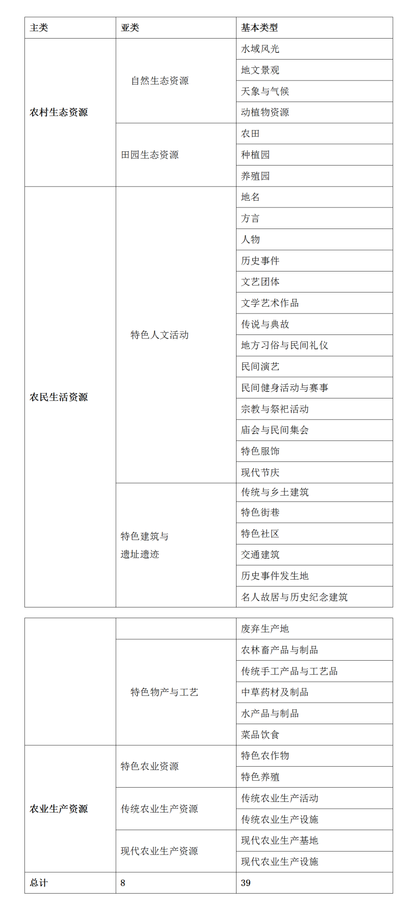 依據(jù)鄉(xiāng)、土、農(nóng)三個方面的主要特征,對鄉(xiāng)村旅游資源進行分類?!班l(xiāng)”對應(yīng)農(nóng)村生態(tài)資源,“土”對應(yīng)農(nóng)民生活資源,“農(nóng)”對應(yīng)農(nóng)業(yè)生產(chǎn)資源。總體分為“主類”、“亞類”和“基本類型”3個層次,共計8個亞類,39個基本類型。