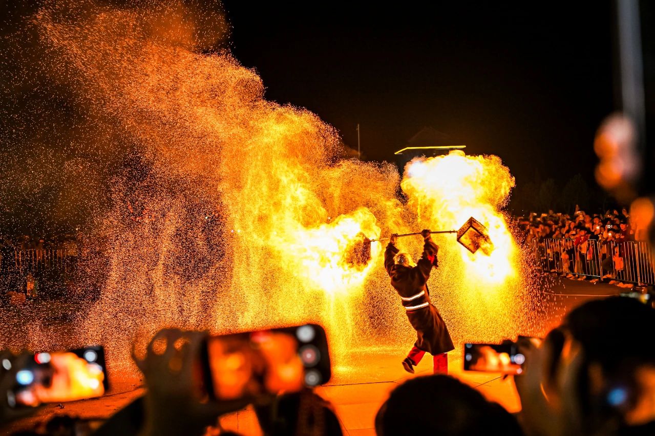 打造系列品牌活動,讓伏羲文化更火、更活、更生動。在伏羲臺璀璨的夜空下,無人機星空秀勾勒出新樂地標與伏羲圖騰的恢弘畫卷,用新質(zhì)生產(chǎn)力詮釋千年文明,營造出震撼人心的視覺盛宴?;樗孜幕?jié)現(xiàn)場,開展中華民族婚俗文化特色展示活動,創(chuàng)新打造“打卡伏羲臺 免費吃家宴”活動品牌。在非遺表演環(huán)節(jié),打樹花、火壺、火刀火棍、火扇火舞等項目在夜空中劃出一道道璀璨的花火,成為游客爭相打卡的亮點。